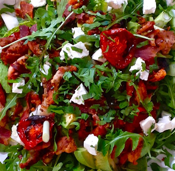 - Meanwhile, arrange some salad leaves in a serving bowl and top with whatever you have going – I used spring onions (red onion would be fine), avocado and thinly-sliced fennel. Scatter the bacon, chicken and roasted tomatoes over the salad and top with any bits of cheese that you happen to have to hand – I used some feta, but any blue cheese, goat’s cheese or other soft cheese would be fine.